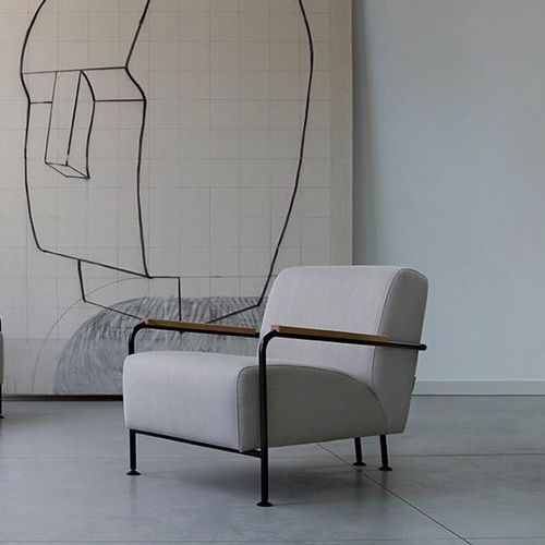 Available in black or white structure, with arms in Iroko wood finish.