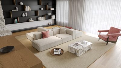 Constructed with a robust plywood and pine frame, layered with high-resilience foam, goose-down filling, and sinuous springs, it delivers plush comfort and support. Upholstered in muslin and non-woven fabrics for a soft yet durable finish, the sofa sits on adjustable plastic legs. Its modular nature, combined with premium materials and cozy aesthetics, makes it a dynamic and inviting seating solution.