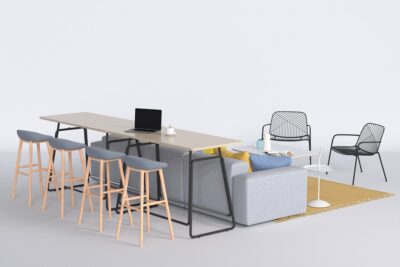 The Link Bar Table draws inspiration from the humble paperclip, transforming its simple loop structure into a sculptural steel base composed of four interconnected rings. This playful yet elegant design supports a minimalist table top, making the piece both functional and visually intriguing. Perfect for collaborative zones and breakout areas, its lightweight aesthetic fosters connection and conversation.