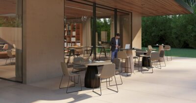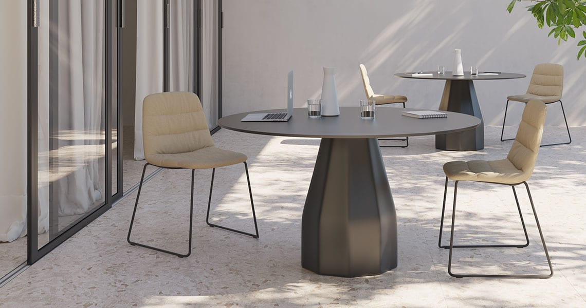 Collaborative Maarten chair with sled base, upholstered in outdoor fabric, convenient for controlled exterior use. Maarten is an ideal chair for collaborative spaces, hotels, restaurants, offices and homes. The smooth outlines of its silhouette embrace the back properly, achieving long-lasting comfort.